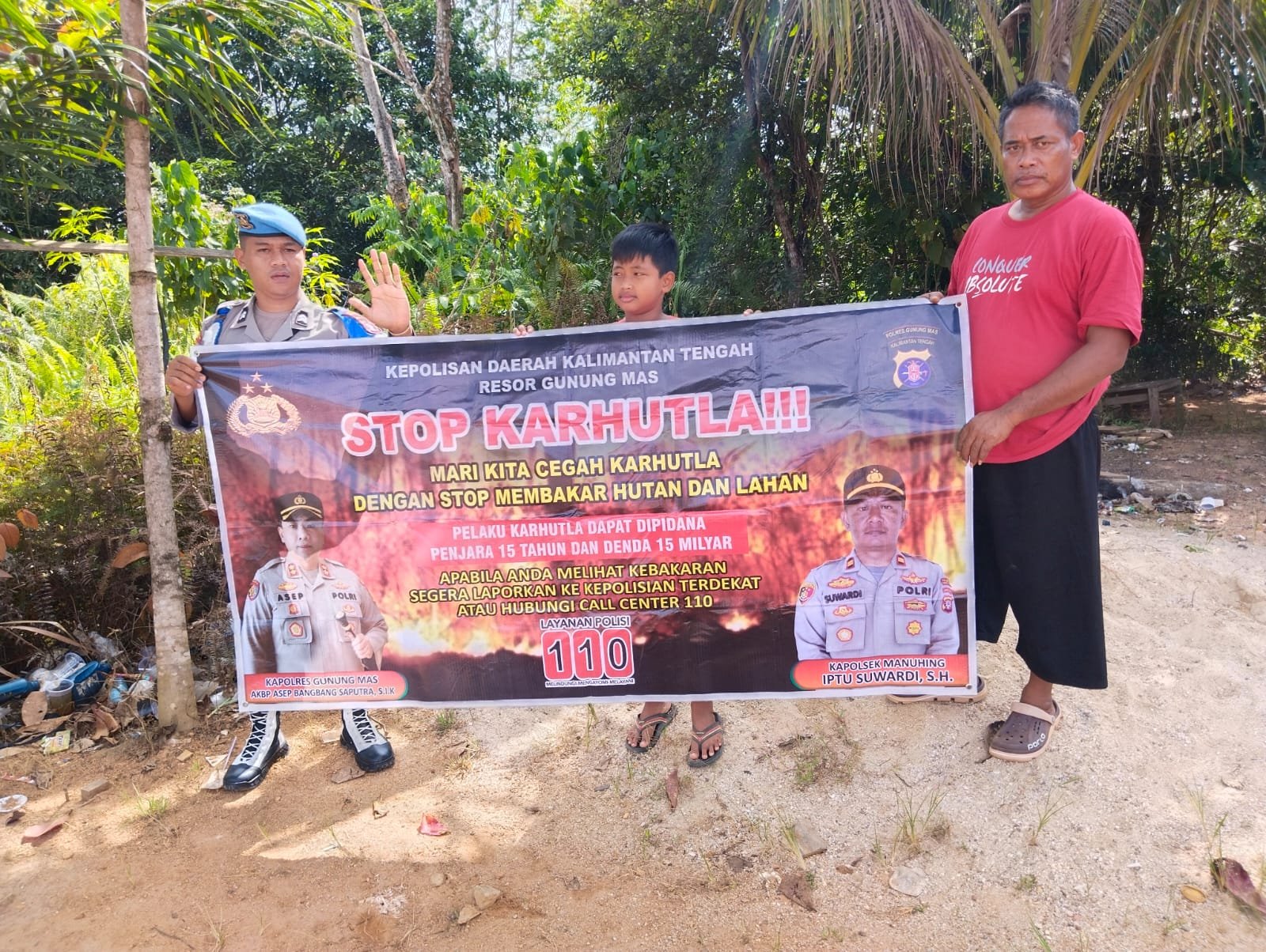Dalam kesempatan ini personel Polsek Manuhing memasang maklumat Polda Kalteng yang berisikan tentang pencegahan Karhutla yang berisikan larangan dan sanksi pidana bagi pelaku pembakar hutan dan lahan kepada masyarakat agar diimplementasikan dan diketahui.