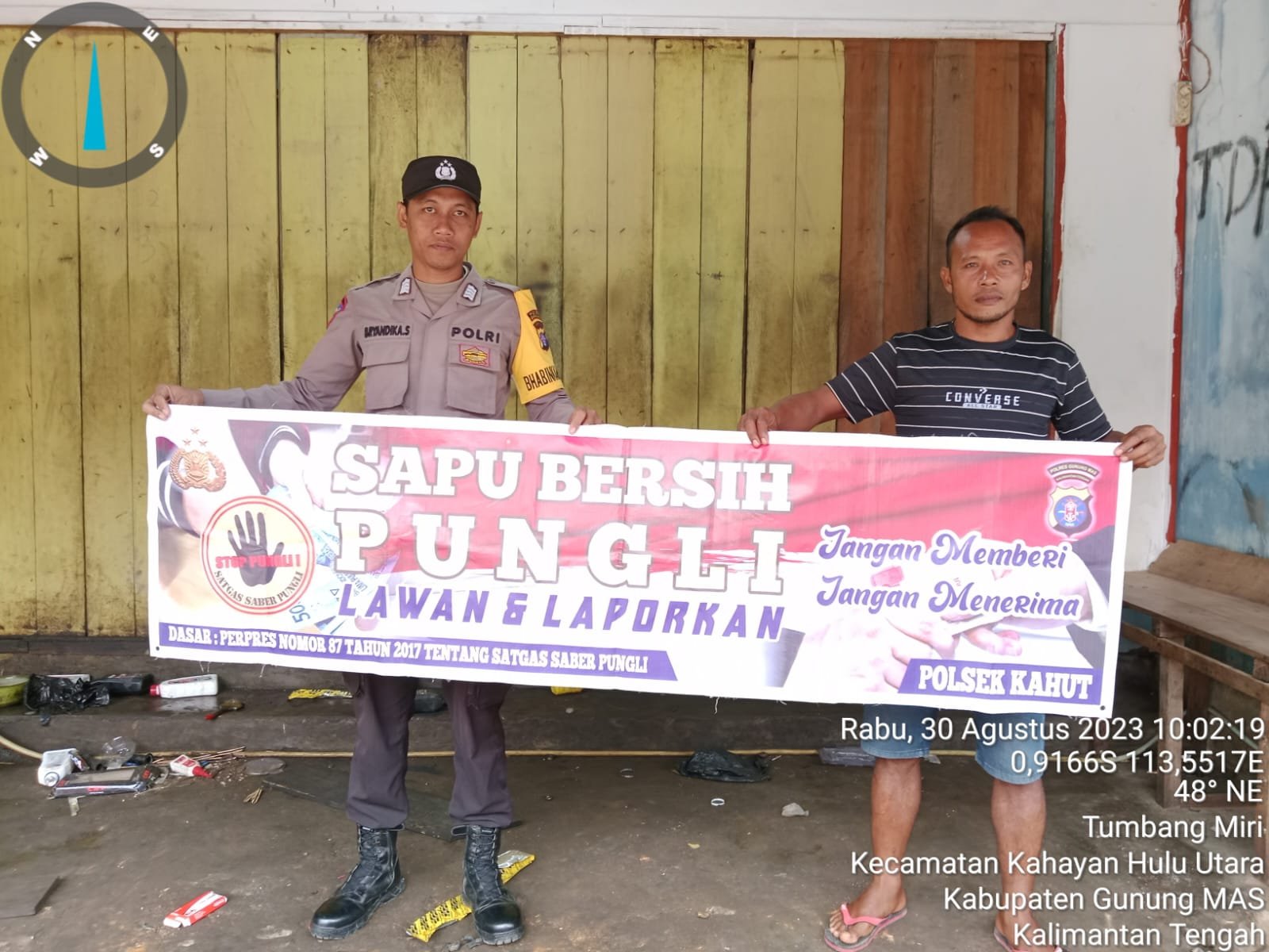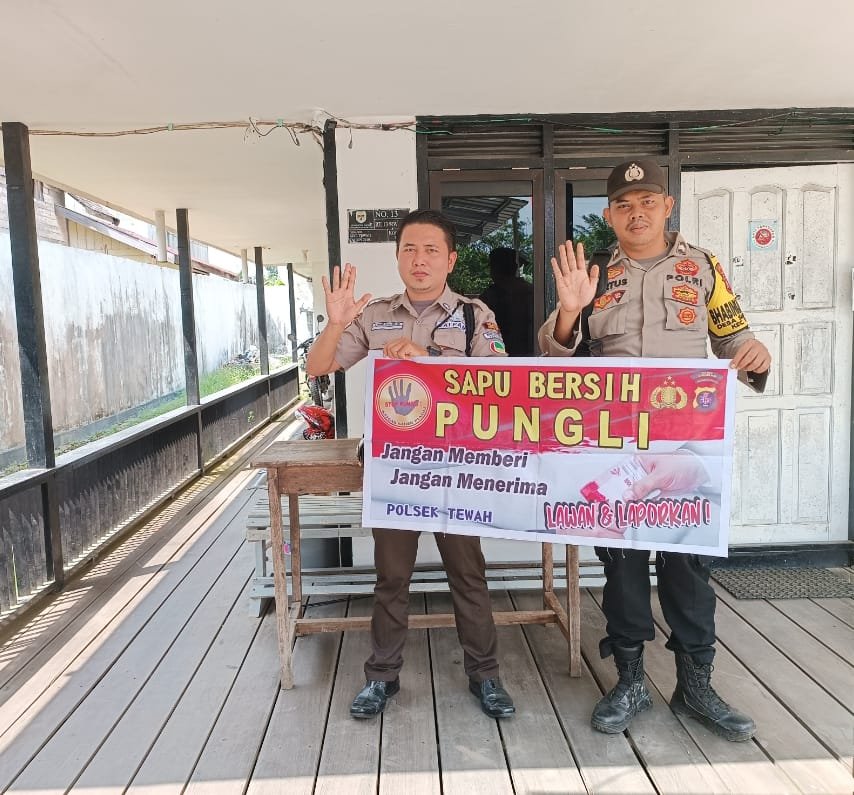 Dalam hal ini Polsek Tewah membentangkan Spanduk Yang Bertuliskan “Stop Pungli… Pemberi dan Penerima sama – sama melanggar hukum, ada pungli laporkan segera. dan sekaligus Mensosialisasikan peraturan presiden nomor 87 tahun 2016 tentang Satuan tugas sapu bersih pungutan liar” kepada masyarakat.