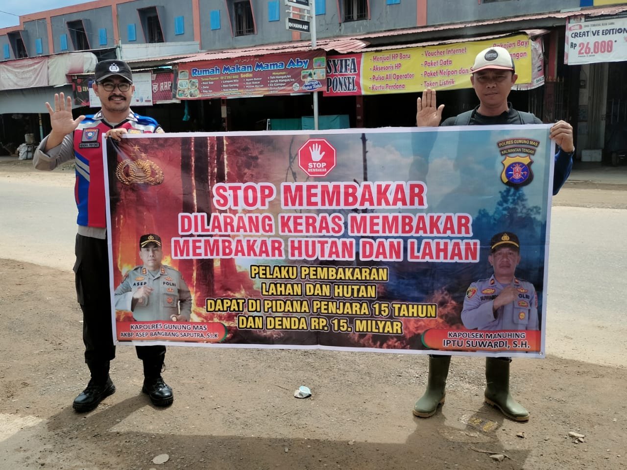 Polres Gunung Mas – Dalam upaya mengantisipasi kebakaran hutan dan lahan (Karhutla), Anggota Polsek Manuhing jajaran Polres Gunung Mas (Gumas) Polda Kalteng melaksanakan sosialisasi tentang larangan membakar  Hutan dan Lahan melalui tebar spanduk berikut sanksi hukumnya kepada warga masyarakat Kel. Tumbang Talaken di Kec. Manuhing Kab. Gumas, Kalteng.Kamis (31/08/2023) pagi.