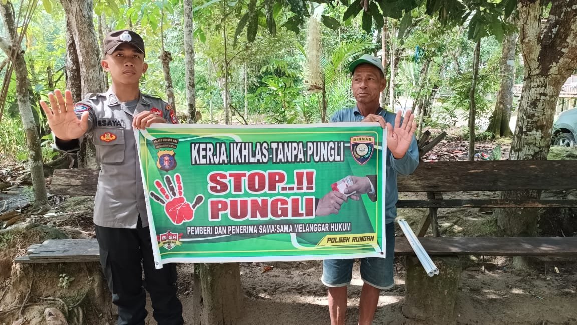 Dalam hal ini Polsek Rungan Polres Gumas membentangkan Spanduk Yang Bertuliskan “Stop Pungli… Pemberi dan Penerima sama – sama melanggar hukum, ada pungli laporkan segera. dan sekaligus Mensosialisasikan peraturan presiden nomor 87 tahun 2016 tentang Satuan tugas sapu bersih pungutan liar” kepada masyarakat.