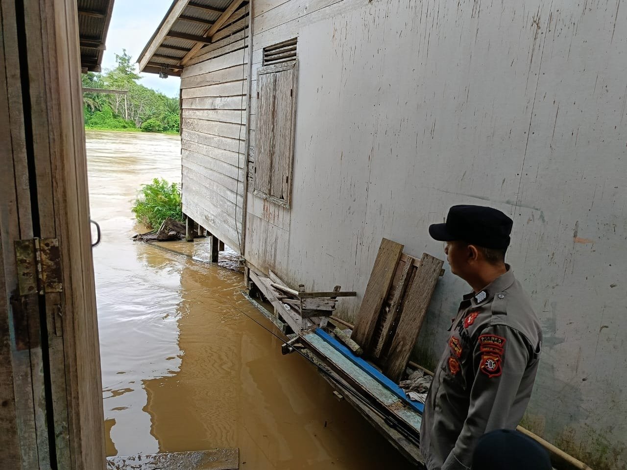 Personel Polsek Tewah melaksanakan patroli pantau debit air sungai Kahayan guna mencegah terjadinya korban dampak dari bencana alam banjir dan memberi himbauan kepada masyarakat.