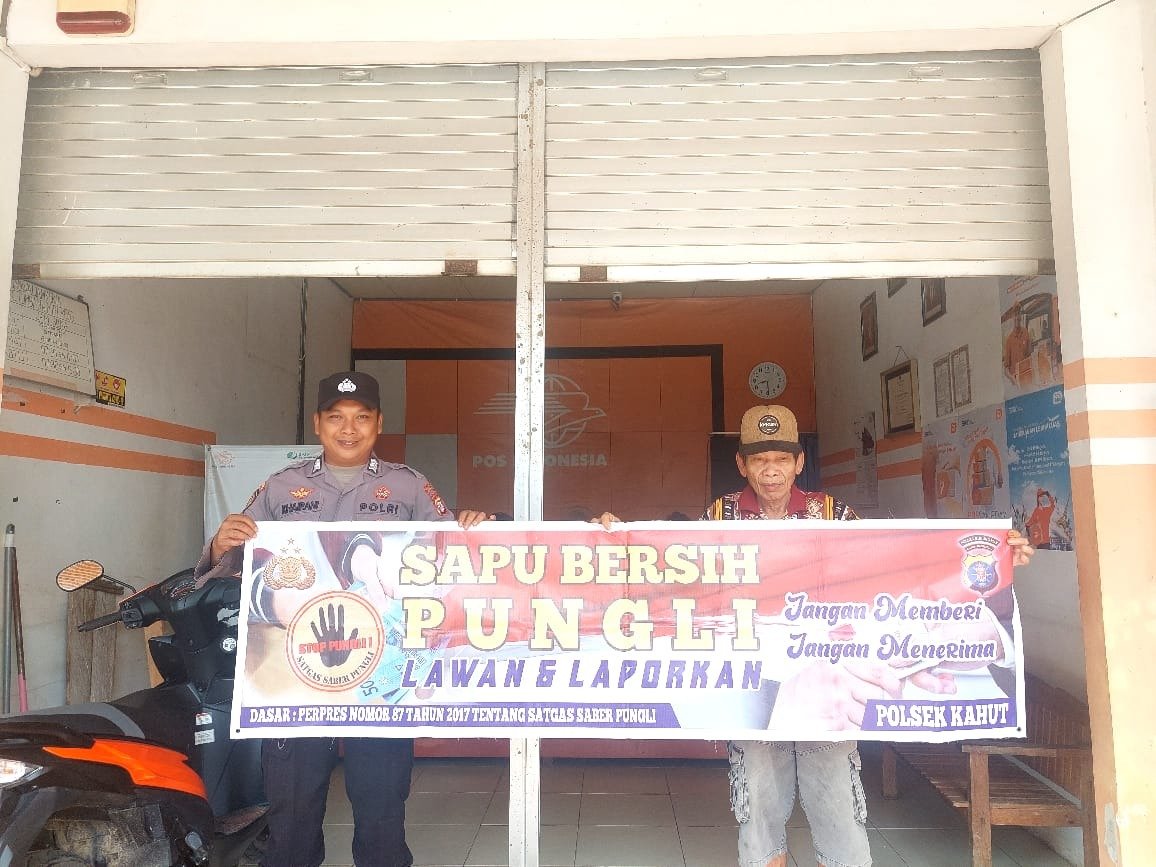 “kami mensosialisasikan peraturan presiden nomor 87 tahun 2016 tentang Satuan tugas sapu bersih pungutan liar,” ucap Kapolsek Kahut Ipda Supono.