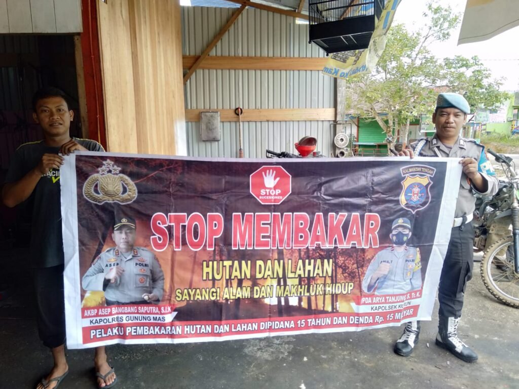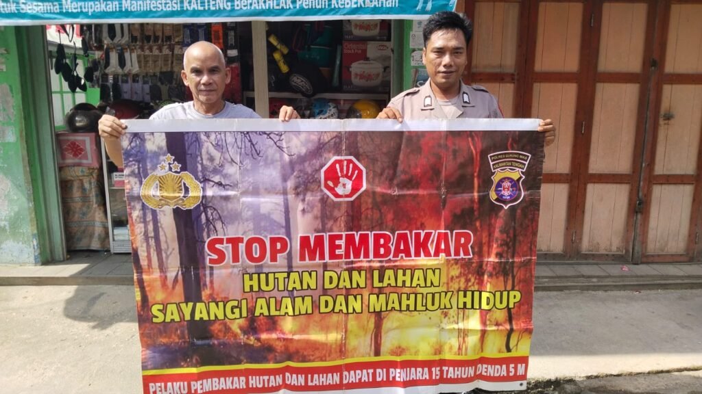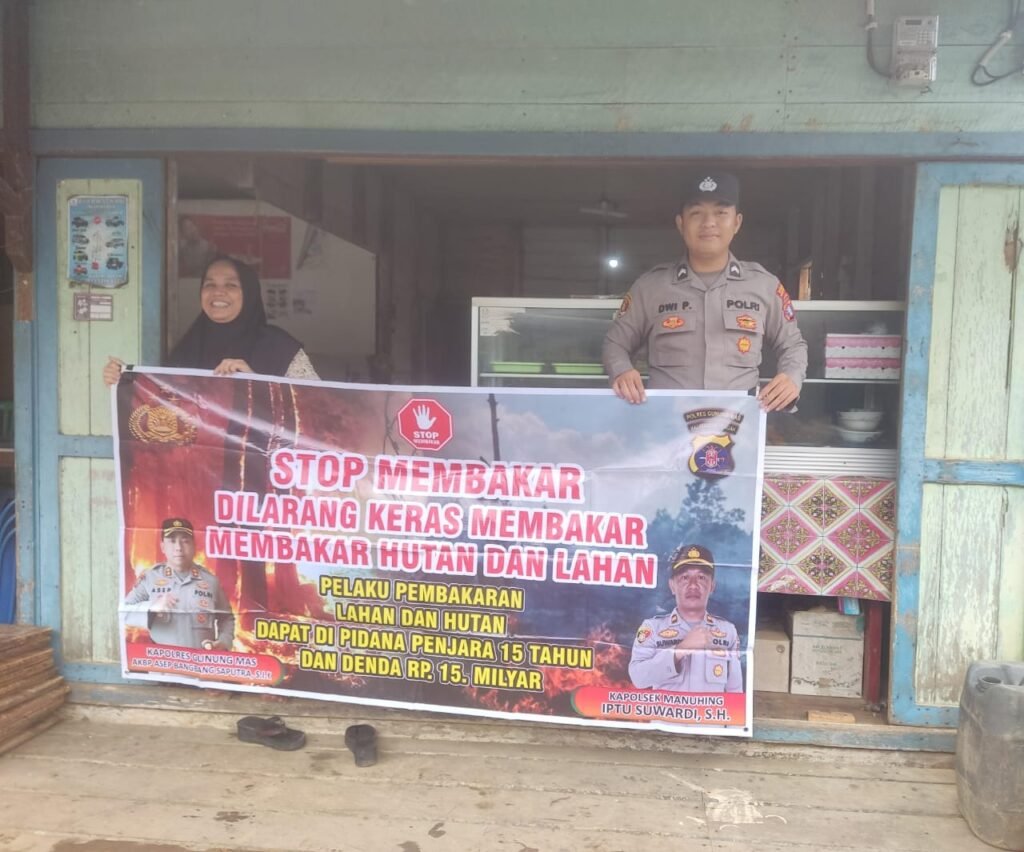 Polres Gunung Mas – Polsek Tewah jajaran Polres Gunung Mas (Gumas) Polda Kalteng dalam aksi mencegah Kebakaran Hutan dan lahan (Karhutla) memberi himbauan seperti menempel sticker/pamplet di rumah atau kios milik masyarakat tentang larangan dan bahaya membakar hutan dan lahan. Sabtu, (16/12/2023) pukul 13.00 Wib.