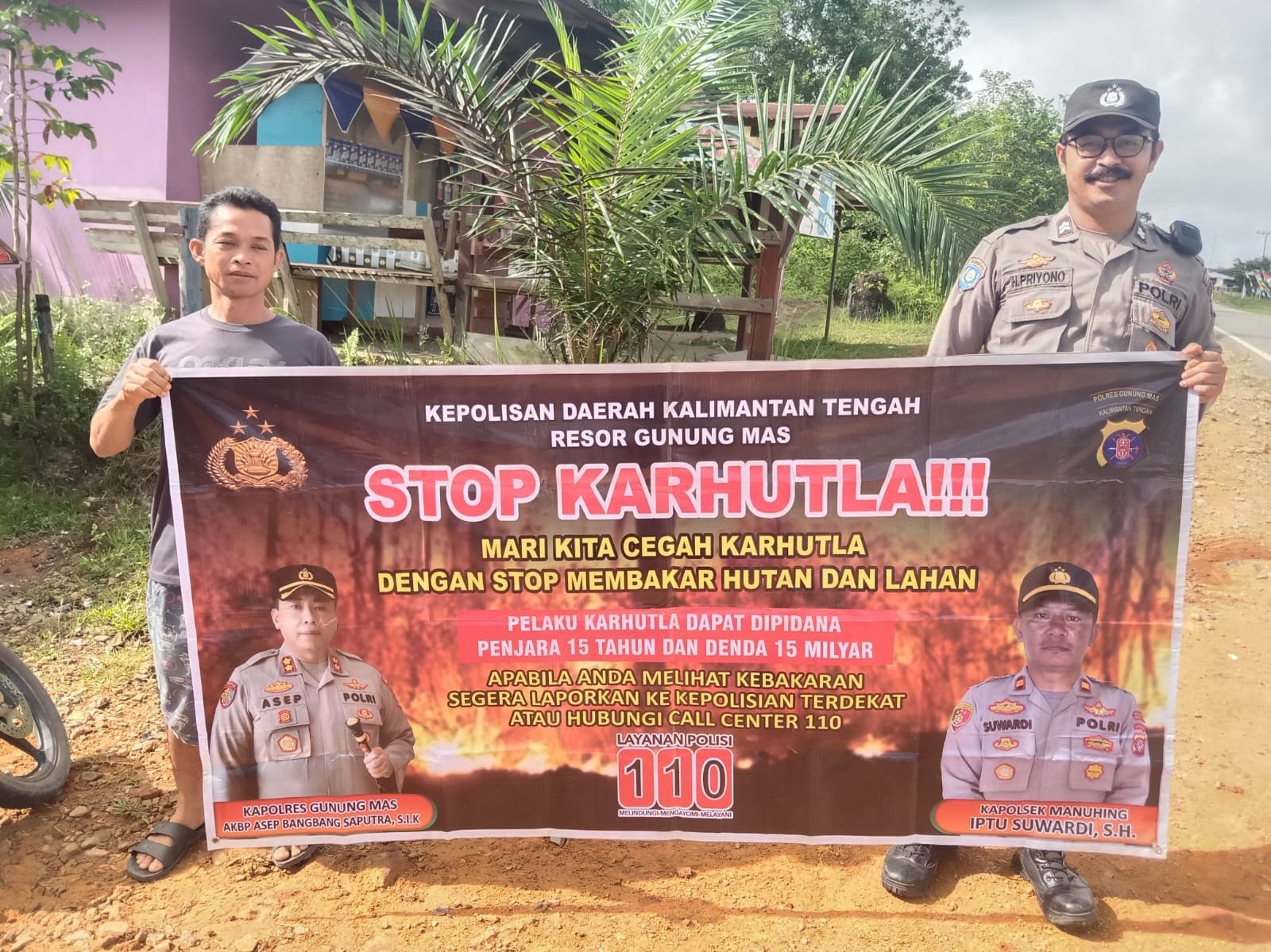 Polres Gunung Mas – Dalam upaya mengantisipasi kebakaran hutan dan lahan (Karhutla), Anggota Polsek Manuhing jajaran Polres Gunung Mas (Gumas) Polda Kalteng melaksanakan sosialisasi tentang larangan membakar Hutan dan Lahan melalui tebar spanduk berikut sanksi hukumnya kepada warga masyarakat Kel. Tumbang Talaken di Kec. Manuhing Kab. Gumas, Kalteng.Sabtu (23/12/2023) pagi.