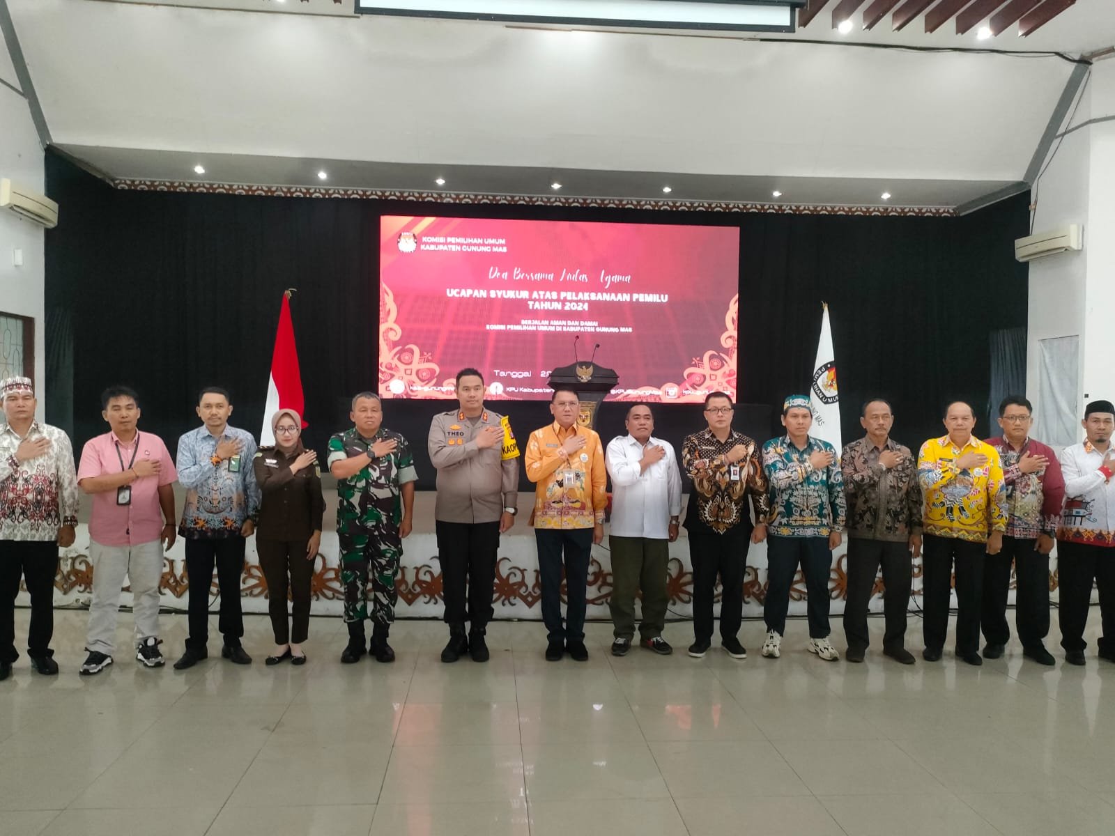 Acara ini merupakan ungkapan syukur atas pelaksanaan Pemilihan Umum 2024 yang berjalan aman dan damai di Kabupaten Gunung Mas. Dalam acara yang dihadiri oleh Sekda Gunung Mas Ricard Fl., S.T., Kapolres Gunung Mas AKBP Theodorus Priyo Santosa, S.I.K., Pabung 1016/PLK Kuala Kurun, Letkol (Inf) Maksum Abadi, S. Ag, Ketua Desk Pemilu Asisten I Bidang Pemerintahan Drs. Lurand, Perwakilan Ketua PN Panitera Muda M. Fadli, S.H. beserta rombongan KPU Provinsi Kalteng. tokoh agama, perwakilan dari berbagai partai politik, dan Tim Desk Pemilu.