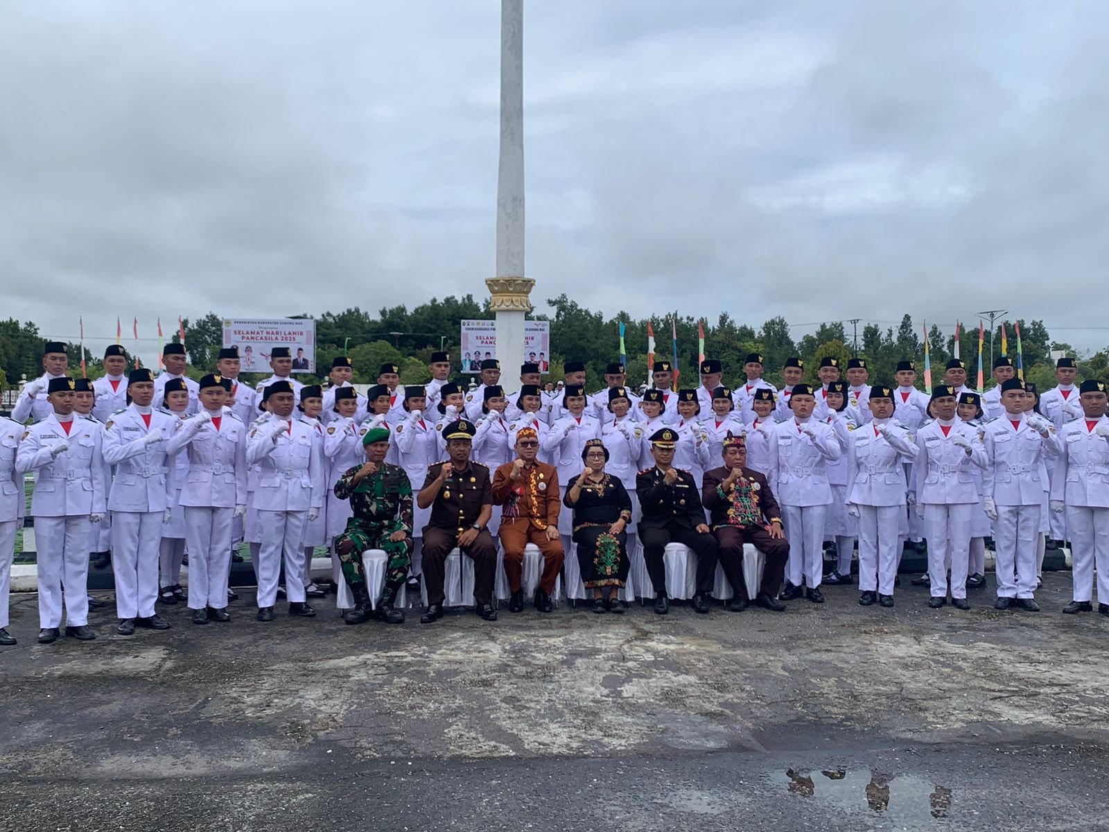 Pasukan upacara yang berbaris rapi terdiri dari satu peleton TNI, satu peleton Polri, 14 peleton ASN dari berbagai instansi, dan dua peleton pelajar, menunjukkan sinergi dan komitmen bersama dalam menghayati nilai-nilai Pancasila.
