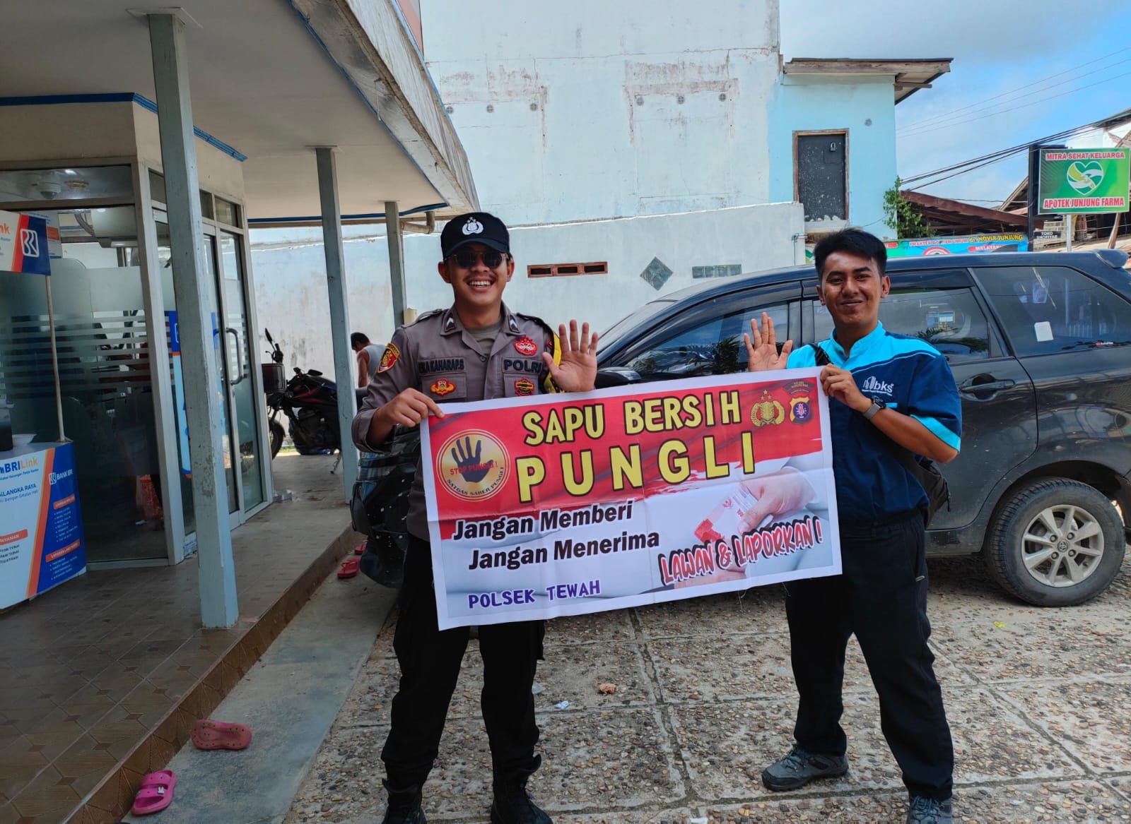 Dalam hal ini Polsek Tewah membentangkan Spanduk Yang Bertuliskan “Stop Pungli… Pemberi dan Penerima sama – sama melanggar hukum, ada pungli laporkan segera. dan sekaligus Mensosialisasikan peraturan presiden nomor 87 tahun 2016 tentang Satuan tugas sapu bersih pungutan liar” kepada masyarakat.