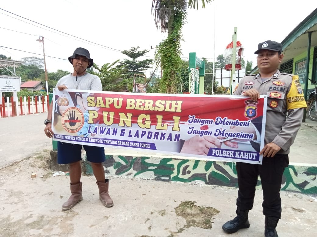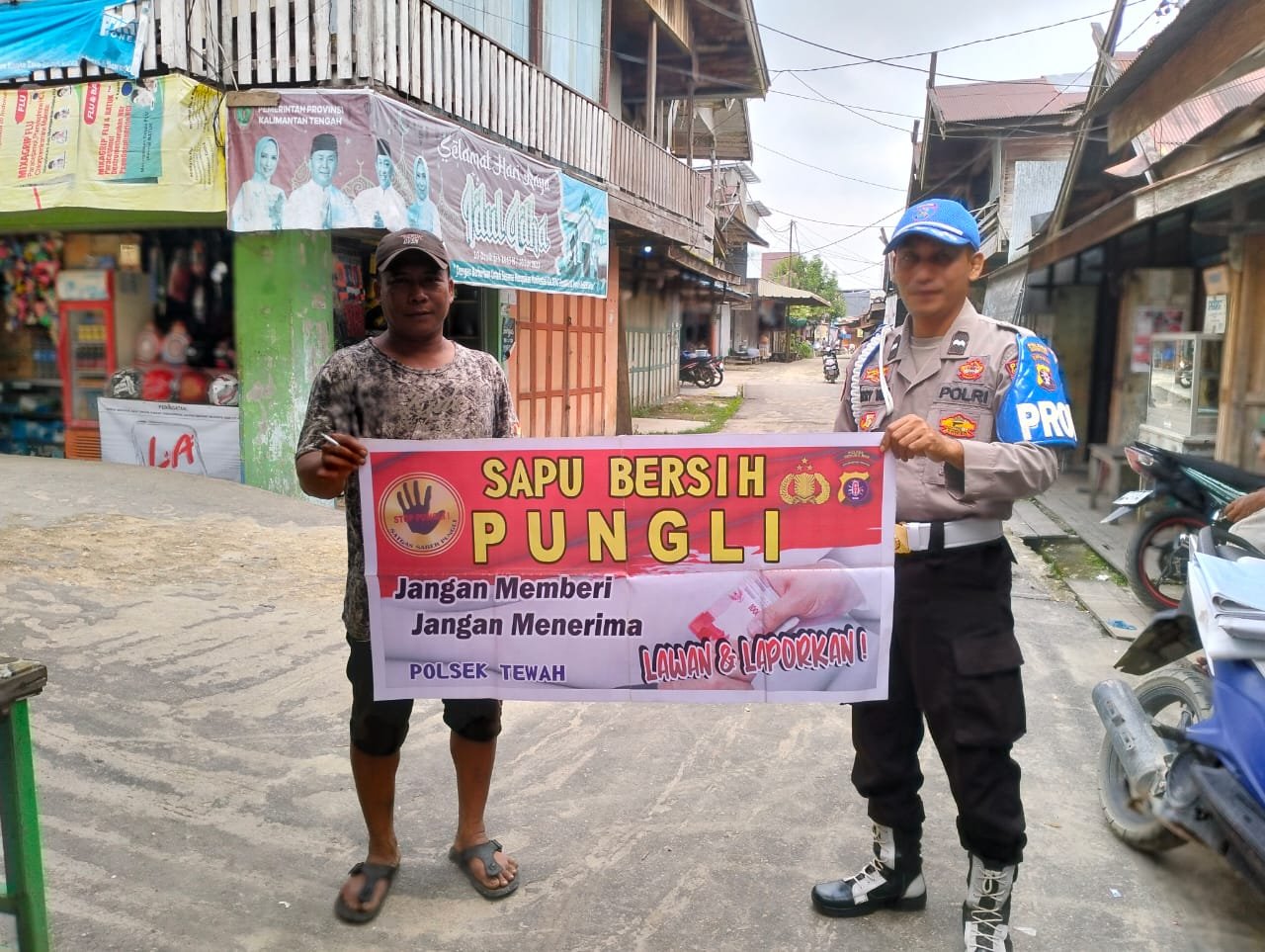 Dalam hal ini Polsek Tewah membentangkan Spanduk Yang Bertuliskan “Stop Pungli… Pemberi dan Penerima sama – sama melanggar hukum, ada pungli laporkan segera. dan sekaligus Mensosialisasikan peraturan presiden nomor 87 tahun 2016 tentang Satuan tugas sapu bersih pungutan liar” kepada masyarakat.