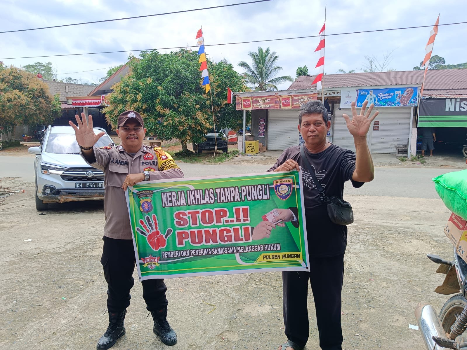Dalam hal ini Polsek Rungan Polres Gumas membentangkan Spanduk Yang Bertuliskan “Stop Pungli… Pemberi dan Penerima sama – sama melanggar hukum, ada pungli laporkan segera. dan sekaligus Mensosialisasikan peraturan presiden nomor 87 tahun 2016 tentang Satuan tugas sapu bersih pungutan liar” kepada masyarakat.