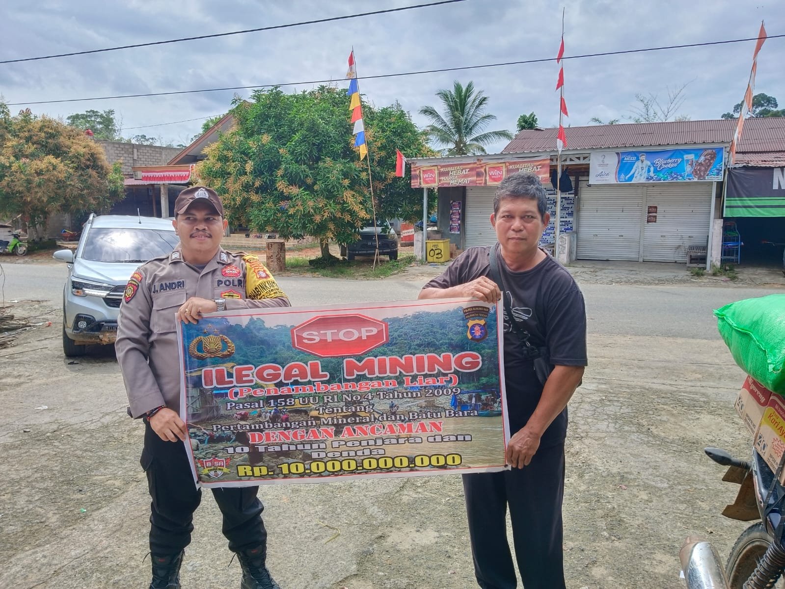 Bhabinkamtibmas Polsek Rungan membentangkan spanduk bertuliskan “ Stop Ilegal Mining serta sanksi pidana” Pasal 158 Undang Undang No.4 tahun 2009 Pidana Penjara 10 tahun dan denda 10 paling banyak 10 Milyar memberikan himbauan bersama-sama dalam menanggulangi Ilegal Mining.