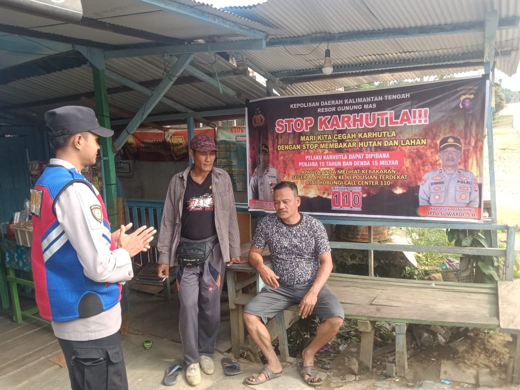 Polres Gunung Mas – Dalam upaya mengantisipasi kebakaran hutan dan lahan (Karhutla), Anggota Polsek Manuhing jajaran Polres Gunung Mas (Gumas) Polda Kalteng melaksanakan sosialisasi tentang larangan membakar  Hutan dan Lahan melalui tebar spanduk berikut sanksi hukumnya kepada warga masyarakat Kel. Tumbang Talaken di Kec. Manuhing Kab. Gumas, Kalteng.senin (28/08/2023) pagi.