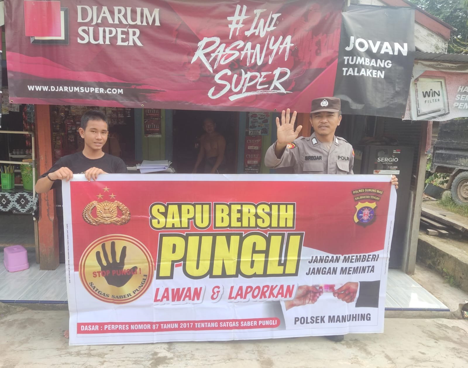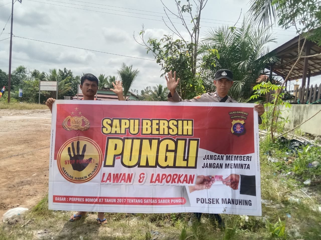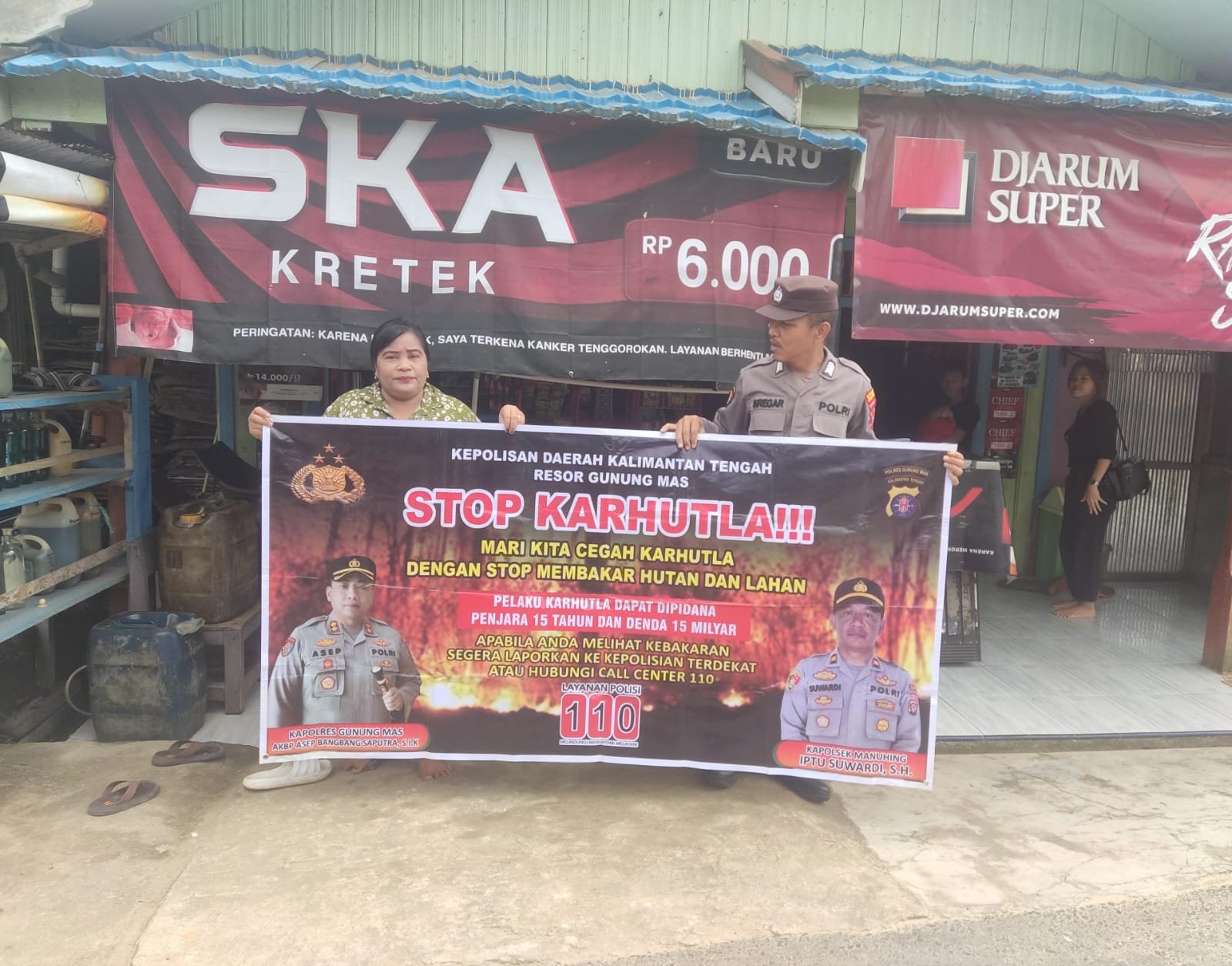 Dalam kesempatan ini personel Polsek Manuhing memasang maklumat Polda Kalteng yang berisikan tentang pencegahan Karhutla yang berisikan larangan dan sanksi pidana bagi pelaku pembakar hutan dan lahan kepada masyarakat agar diimplementasikan dan diketahui.