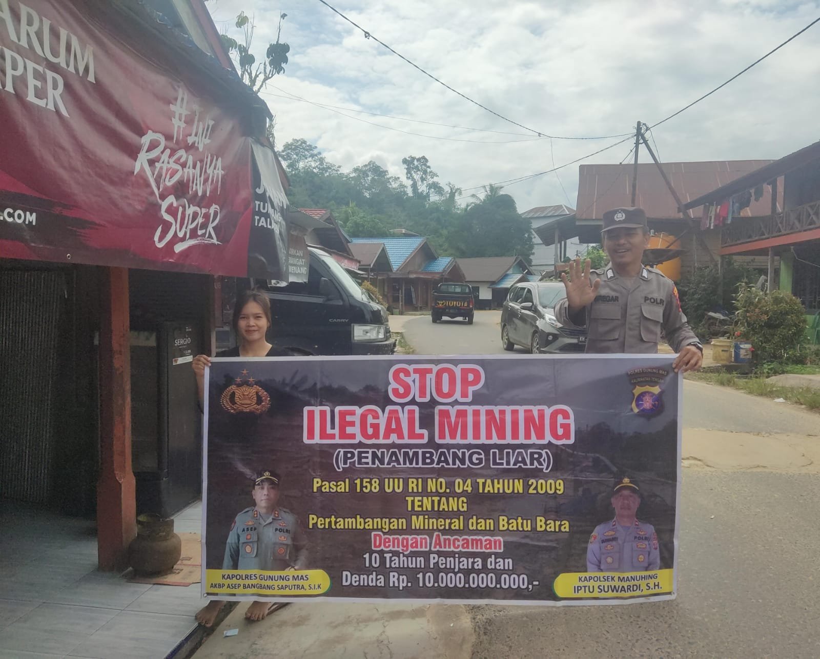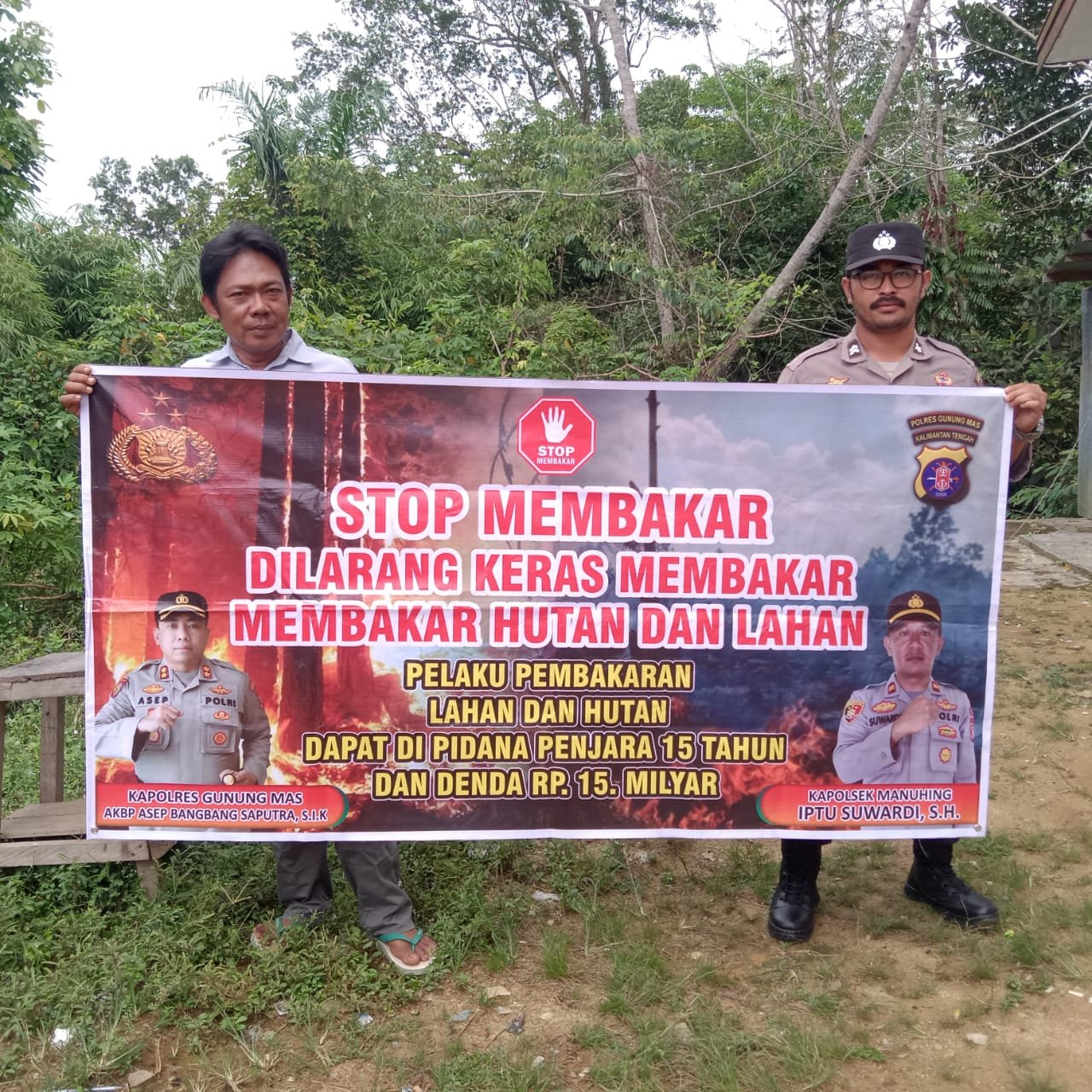 Polres Gunung Mas – Dalam upaya mengantisipasi kebakaran hutan dan lahan (Karhutla), Anggota Polsek Manuhing jajaran Polres Gunung Mas (Gumas) Polda Kalteng melaksanakan sosialisasi tentang larangan membakar Hutan dan Lahan melalui tebar spanduk berikut sanksi hukumnya kepada warga masyarakat Kel. Tumbang Talaken di Kec. Manuhing Kab. Gumas, Kalteng. Minggu (24/09/2023) pagi.